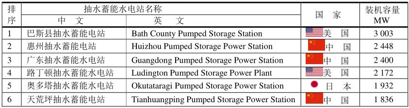 世界上第一座抽水蓄能電站是瑞士于1879年建成的勒頓抽水蓄能電站。當(dāng)今世界上最大的抽水蓄能電站是美國(guó)巴斯康蒂抽水蓄能電站,裝機(jī)容量達(dá)3003MW,其次為中國(guó)惠州抽水蓄能電站,裝機(jī)容量為2448 MW,廣東抽水蓄能水電站(Guangdong Pumped Storage Power Station),裝機(jī)容量為2400MW。