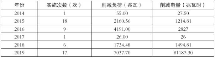 在需求響應(yīng)實(shí)施早期,實(shí)施目的主要是為了應(yīng)對(duì)夏季高峰時(shí)段電力消費(fèi)緊張狀況,最大程度削減高峰電力負(fù)荷對(duì)電網(wǎng)安全的影響,保障了民生用電和重點(diǎn)用電安全平穩(wěn)。2014~2019年度國內(nèi)開展削峰需求響應(yīng)的情況如下表所示。