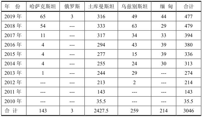 世界上天然氣儲(chǔ)量最多的國(guó)家是俄羅斯,土庫(kù)曼斯坦居世界第四位。中國(guó)管輸天然氣進(jìn)口依靠資源豐富的俄羅斯和中亞國(guó)家,最早的最重要的出口國(guó)是土庫(kù)曼斯坦,于2010年開(kāi)始出口,到2019年總量已經(jīng)達(dá)到2427.5億立方米;其次是烏茲別斯坦、緬甸和哈薩克斯坦。俄羅斯從2019年也開(kāi)始出口到中國(guó),而且將會(huì)逐年增加,成為管輸出口到中國(guó)最多的國(guó)家。