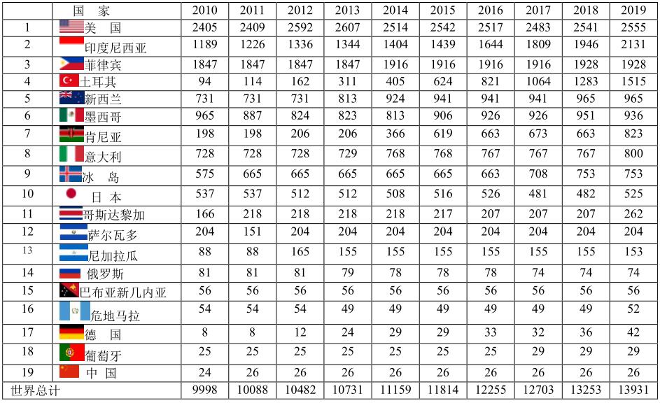 2019年占地?zé)嵫b機(jī)總?cè)萘孔疃嗟氖敲绹?guó)(18.3%)、印度尼西亞(15.3%)、菲律賓(13.8%)、土耳其(10.9%)、新西蘭(6.9%)。中國(guó)排序第19名,地?zé)嵫b機(jī)容量進(jìn)展不大。
