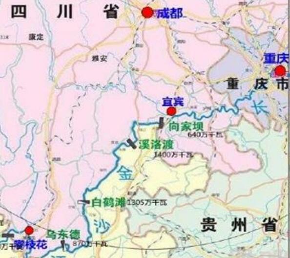 ▲ 四川長江-金沙江段修建了四座世界級的水電站:向家壩、溪洛渡、白鶴灘、烏東德。這四座水電站裝機總?cè)萘窟_46508MW,為三峽水電站裝機容量22500 MW的46508/22500=2.07倍。