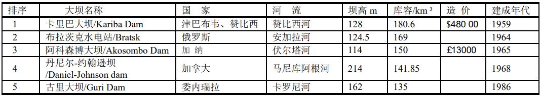 ▲ 世界上儲水量最多的大壩是津巴布韋和贊比西的贊比西河(Zambezi River)上的卡里巴大壩(Kariba Dam),1959年建成,儲水量為180.6km3,其次為俄羅斯安加拉河上的布拉茨克大壩(Bratsk Dam)和加納沃爾特湖阿科松博壩(Akosombo Dam),庫容169 km3。
