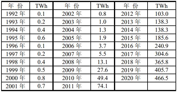 中國(guó)風(fēng)電場(chǎng)發(fā)電量進(jìn)程(單位:TWh)