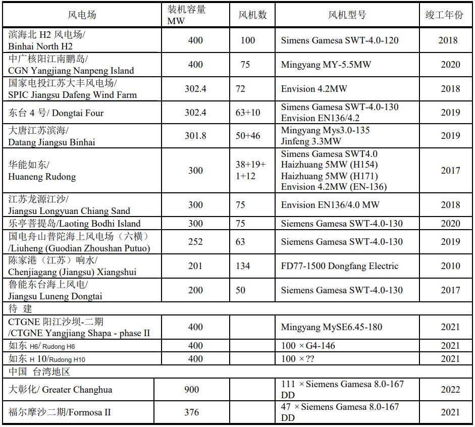 中國(guó)大于200 MW運(yùn)行的海上風(fēng)電場(chǎng)