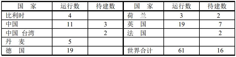 目前全球裝機(jī)容量大于200 MW的海上風(fēng)電場(chǎng)有61個(gè)風(fēng)電場(chǎng)在運(yùn)行,待建的海上風(fēng)電場(chǎng)有16座。目前海上風(fēng)電場(chǎng)主要在西歐國(guó)家,如德國(guó)和英國(guó)。