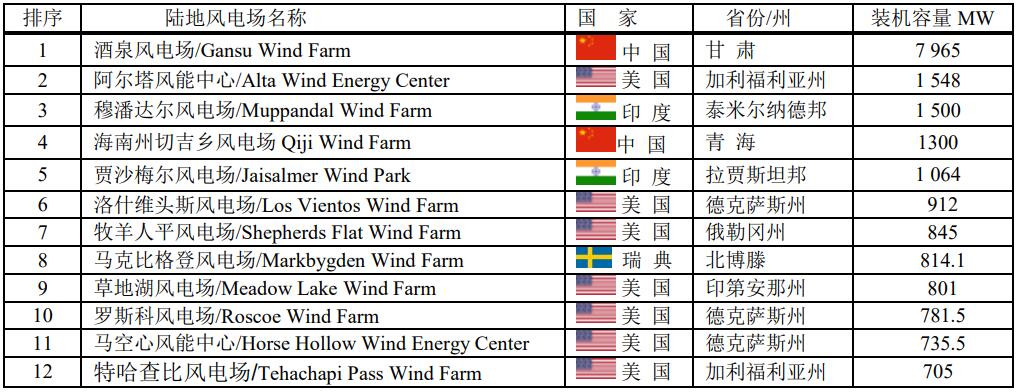 全球最大的前12大的陸上風(fēng)電場(chǎng),美國(guó)最多,占7座。盡管中國(guó)風(fēng)力發(fā)電量居全球之首,僅占2座。