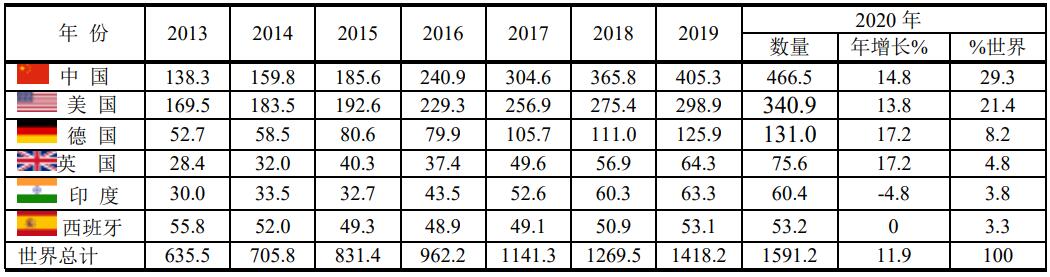 根據(jù)BP2021年的統(tǒng)計(jì),中國(guó)裝機(jī)容量占全球總量的百分率如表。
