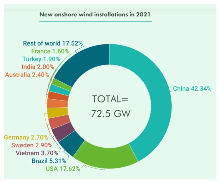 2021年全球風電新增裝機93.6GW,具體國家排名如下: