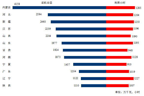 圖3 1-6月份風(fēng)電裝機較多省份風(fēng)電裝機容量和設(shè)備利用小時