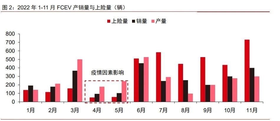根據(jù)中汽協(xié)以及中信保數(shù)據(jù),2022年前11月FCEV產(chǎn)量為2969輛,銷量為 2789輛,上險總數(shù)為3755輛。2022年上半年產(chǎn)量一直大于銷量,主要系 2021年下半年確定燃料電池示范城市群政策,業(yè)內(nèi)熱情與預(yù)期較高。但是受制于疫情與補(bǔ)貼落地速度,銷量推進(jìn)速度較慢,形成了一定的庫存壓力。據(jù)氫云鏈微信公眾號數(shù)據(jù),2021年年底庫存量為280輛左右,今年7月庫存增加到750 輛,導(dǎo)致8月開始減產(chǎn)去庫存。從上險量數(shù)據(jù)看,2022年前5月上險量數(shù)據(jù)欠佳,6月上險量陡增,一方面是因為6月疫情相對緩和,前期被延遲的訂單出現(xiàn)了集中交付的情況;另一方面也與示范城市群首年推廣考核臨近(2022年8 月)有關(guān),但是除京津冀城市群以外,其他城市群第一年推廣進(jìn)度并不理想,2022年跟計劃相比“拖欠”的量,或在2023年釋放。