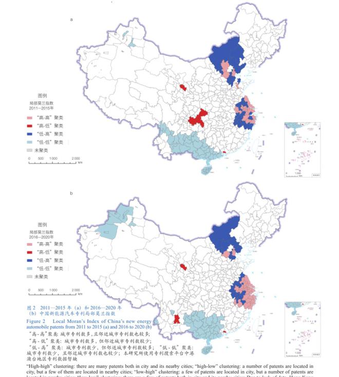 圖2進(jìn)一步說(shuō)明了專利申請(qǐng)的空間集聚現(xiàn)象具體的空間分布特征。① 與北京市鄰近的天津市、保定市和張家口市均為“高-高”聚類地區(qū),但同時(shí)也存在唐山市、廊坊市等“低-高”聚類地區(qū)。這反映出北京市作為新能源汽車研發(fā)的核心城市,對(duì)其鄰近城市具有一定的知識(shí)溢出效應(yīng),但其溢出具有較為明顯的指向性——雖然部分城市對(duì)于北京市地理鄰近,但北京市知識(shí)溢出并沒有對(duì)其產(chǎn)生較為明顯的影響。② 在長(zhǎng)江三角洲城市群地區(qū)具有顯著新能源汽車專利空間集聚現(xiàn)象,以上海市、南京市、杭州市和寧波市等為代表的城市形成了“高-高”聚類的連片區(qū)。同時(shí),比較2011—2015年和2016—2020年的局部莫蘭指數(shù)空間格局可以發(fā)現(xiàn),在2011—2015年,屬于“高-高”聚類的城市外圍存在大量屬于“低-高”聚類的城市,主要分布于浙江省南部、江蘇省北部和安徽省東部;而隨著新能源汽車產(chǎn)業(yè)的發(fā)展,這些城市逐漸從“低-高”聚類轉(zhuǎn)變?yōu)?ldquo;高-高”聚類,“低-高”聚類區(qū)進(jìn)一步向外圍延伸,這表現(xiàn)出顯著的依托地理鄰近性的知識(shí)溢出效應(yīng)。③ 廣東省西部、廣西壯族自治區(qū)和云南省存在連片的“低-低”聚類區(qū)。這3個(gè)省份均擁有一定的汽車制造業(yè)基礎(chǔ),但涉及新能源汽車的企業(yè)相對(duì)較少。盡管廣東省擁有比亞迪等重要新能源汽車企業(yè),但其知識(shí)溢出也僅局限于粵港澳大灣區(qū),難以產(chǎn)生較為明顯的地理鄰近上的知識(shí)溢出。