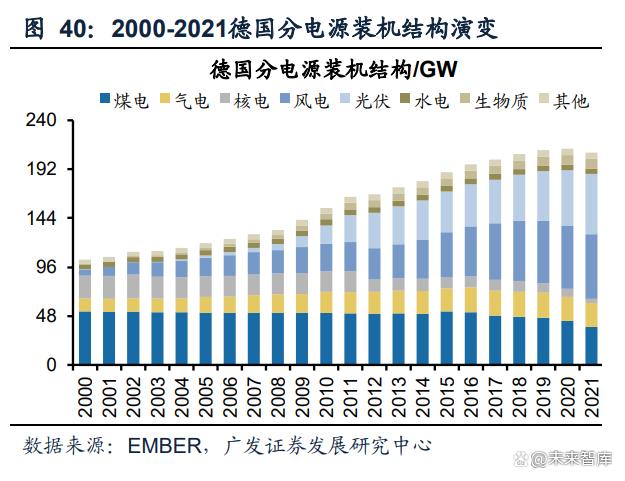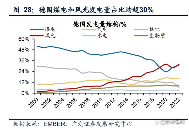 新能源滲透率提升的同時(shí),德國保留一定火電裝機(jī)用于調(diào)峰。與丹麥不同,德國在 風(fēng)光發(fā)電量提升的同時(shí),始終保留一定的煤電、并新增一批氣電裝機(jī)解決風(fēng)光消納 問題,這與德國資源稟賦有關(guān),德國是歐盟最大的煤炭產(chǎn)出國,2021年德國煤炭產(chǎn)量占?xì)W盟的38%,這與我國頗為相似。2000-2021年德國煤電和氣電裝機(jī)占比從63.3% 降低至29.2%,風(fēng)光裝機(jī)占比從6.0%提升至58.7%,新增裝機(jī)主要由風(fēng)光貢獻(xiàn)。發(fā)電 量結(jié)構(gòu)來看,2000-2021年德國煤電和氣電發(fā)電量占比從61.0%降低至44.6%,風(fēng)光 發(fā)電量占比從1.6%提升至28.2%,火電仍然保持了一定比例用于調(diào)峰。
