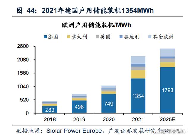 德國除保留火電裝機(jī)外,還積極發(fā)展儲能。與丹麥不同,德國用電規(guī)模大,風(fēng)光消 納面臨形勢更嚴(yán)峻,除了保留一定規(guī)模的火電裝機(jī)外,德國還積極發(fā)展儲能,儲能 規(guī)模排在歐洲國家前列,同時(shí)德國電網(wǎng)跨度大,儲能調(diào)度困難,因此重點(diǎn)發(fā)展戶用 儲能,2021年德國戶用儲能占?xì)W洲比例達(dá)61%。