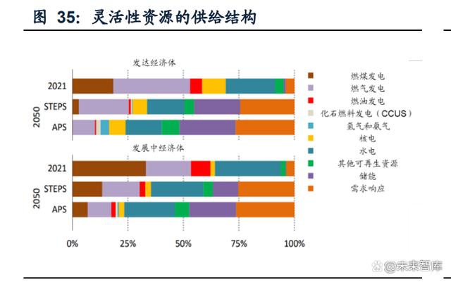 靈活調(diào)節(jié)電源與可再生能源發(fā)電裝機(jī)的配比不斷提升。歐洲國家靈活電源比重相對 較高,德國、丹麥、西班牙、英國的靈活調(diào)節(jié)電源與可再生能源發(fā)電裝機(jī)的配比分別 為44%、43%、140%和190%。在歐洲五大電力市場中(英國、德國、法國、意大利 和西班牙),Wood Mackenzie預(yù)測到2040年將新增169GW風(fēng)電和172GW光伏裝機(jī), 與之對應(yīng)的電力系統(tǒng)靈活性資源將從2020年的122GW增至2030年的202GW、2040 年的260GW,靈活性電源的裝機(jī)占比再度提升。 火電是現(xiàn)階段靈活性調(diào)節(jié)的主要電源,儲能和需求側(cè)響應(yīng)將接力火電成為能源結(jié)構(gòu) 轉(zhuǎn)型的后備主力。電力系統(tǒng)的靈活性資源包括發(fā)電側(cè)、電網(wǎng)側(cè)、需求側(cè)響應(yīng)和儲能 四類。從靈活性調(diào)節(jié)的供給結(jié)構(gòu)來看,火電提供了目前維持電力系統(tǒng)可靠性所需要 的大部分靈活性電源,其次是水電和需求側(cè)響應(yīng)。在近十年,火電仍是靈活性調(diào)節(jié) 的主要電源,其次是電池儲能和需求側(cè)響應(yīng)的大規(guī)模增長,是能源結(jié)構(gòu)轉(zhuǎn)型的后備 主力。