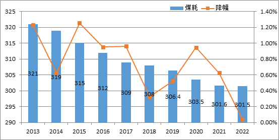 圖19 2013—2022年供電煤耗和降幅(單位:克/千瓦時(shí))