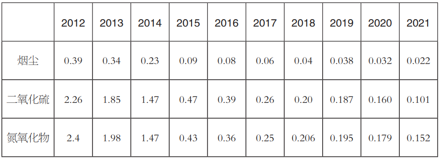 表11 2012—2021年單位火電發(fā)電量的排放量(單位:克/千瓦時(shí))