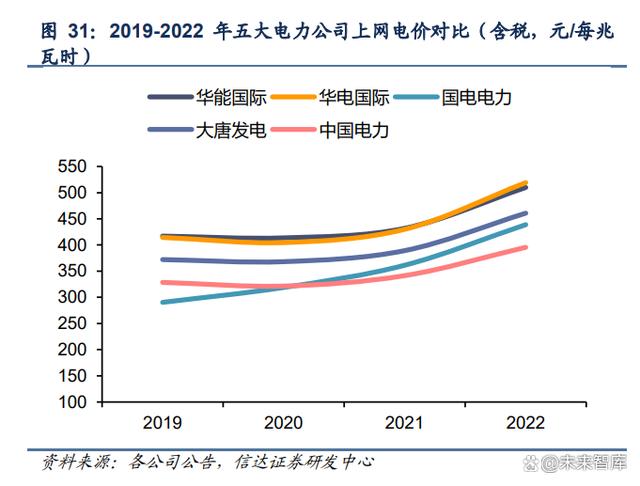 2022 年五大電上網(wǎng)電價同比上漲明顯,上浮幅度普遍在 18%-20%。2022 年,五大電的煤 電上網(wǎng)電價普遍實現(xiàn)上浮,而由于傳統(tǒng)能源裝機比重較大,2022 年國電電力和華電國際綜合上網(wǎng)電價的上浮最為顯著,其中國電電力上網(wǎng)電價達到 438.88 元/兆瓦時,同比漲幅 21.5%,華電國際上網(wǎng)電價達到 519.25 元/兆瓦時,同比漲幅 20.8%。隨著我國市場化電價 機制的進一步完善,電價上浮空間未來有望逐步打開。