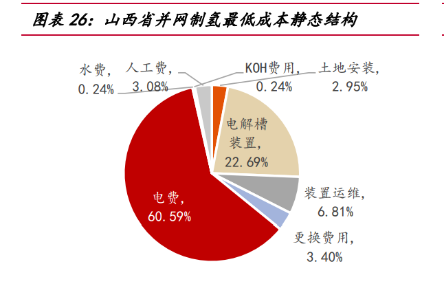 山西省經(jīng)濟(jì)利用小時(shí)數(shù)為 1915 小時(shí),并網(wǎng)制氫單位成本最低:截止 2022Q3,山 西省風(fēng)電光伏裝機(jī)量占比位列全國(guó)第 14,但由于負(fù)荷較少,山西省低電價(jià)小時(shí)數(shù)在 五個(gè)省份中較為顯著, 0~0.05 元/kWh 共計(jì) 1341 小時(shí),0.3~0.35 元/kWh 共計(jì) 1219 小時(shí),低電價(jià)優(yōu)勢(shì)明顯。經(jīng)過(guò)我們的測(cè)算,當(dāng)利用小時(shí)數(shù)為 1915 小時(shí),綜合電價(jià) 0. 1868 元/kWh,山西制氫成本最低為 15.2 元/kg,考慮氧氣售后沖減費(fèi)用,制氫成本 下降至 9.6 元/kg。山西省并網(wǎng)制氫成本結(jié)構(gòu)中,因現(xiàn)貨市場(chǎng)低電價(jià)優(yōu)勢(shì)顯著,電費(fèi) 占比相對(duì)較低,僅 60.59%,電費(fèi)之中,電能量?jī)r(jià)格占 42%,輸配容量?jī)r(jià)格占 36%。