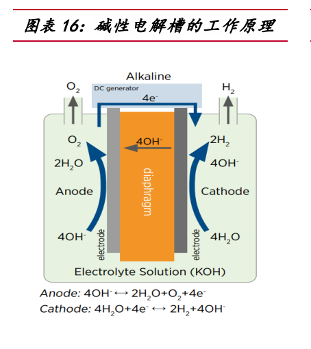 按照工作原理和電解質(zhì)的不同,電解水制氫技術(shù)可分為 4 種。堿性電解水技術(shù) (ALK)、質(zhì)子交換膜電解水技術(shù)(PEM)、高溫固體氧化物電解水技術(shù)(SOEC)和固體聚合物陰離子交換膜電解水技術(shù)(AEM)。其中,堿性電解槽的成本較低,經(jīng)濟(jì)性較好,2022 年國(guó)內(nèi)堿性電解槽出貨占 97%,但相較于 PEM 的靈活性較差,PEM 受限于質(zhì)子膜高成 本,總體設(shè)備成本是堿性電解槽 3-4 倍。 堿性電解槽的電解液一般為 30%質(zhì)量濃度的 KOH 溶液或者 26%質(zhì)量濃度的 NaOH 溶液。在直流電的作用下,陰極發(fā)生還原反應(yīng),生成氫氣和氫氧根離子,陽(yáng)極發(fā)生氧 化反應(yīng),生成氧氣和水。經(jīng)過(guò)氣水分離器將氣體和溶液分離,電解液回流至電解槽, 氫氣和氧氣分別進(jìn)入純化裝置提純后進(jìn)行收集。