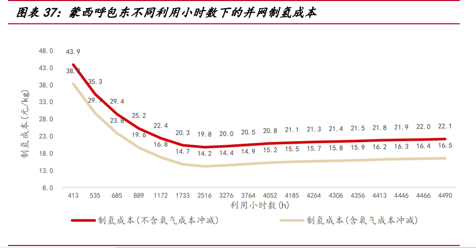 蒙西經(jīng)濟(jì)利用小時(shí)數(shù)為 2516 小時(shí),成本有較大下降空間:蒙西低電價(jià)小時(shí)數(shù)相 對(duì)分散,-0.05~0 元/kWh 共計(jì) 408 小時(shí),0.25~0.3 元/kWh 共計(jì) 561 小時(shí),整體上并 網(wǎng)制氫成本劣于山西和甘肅省,但優(yōu)于山東和廣東省。當(dāng)利用小時(shí)數(shù)為 2516 小時(shí), 綜合電價(jià) 0.308 元/kWh,蒙西并網(wǎng)制氫成本最低為 19.75 元/kg,考慮氧氣售后沖減 費(fèi)用,制氫成本下降至 14.15 元/kg。蒙西并網(wǎng)制氫成本結(jié)構(gòu)中,電費(fèi)占比 76.84%。 電費(fèi)之中,電能量?jī)r(jià)格占 71%,輸配容量?jī)r(jià)格占 14%??紤]到蒙西有豐富的風(fēng)光發(fā)電 資源,未來(lái)風(fēng)光發(fā)電滲透率提升空間較大,電價(jià)分布或?qū)⑦M(jìn)一步左偏,降低并網(wǎng)制氫 成本。