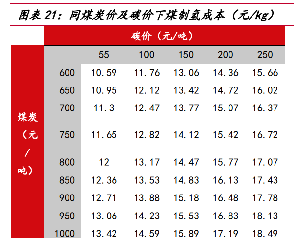 若考慮碳排放價(jià)格,化石能源制氫經(jīng)濟(jì)性進(jìn)一步下降。根據(jù) IEA,煤制氫路線(xiàn) 1kg 氫氣產(chǎn)生約 26kg 二氧化碳、天然氣制氫路線(xiàn) 1kg 氫氣產(chǎn)生約 10kg 二氧化碳,按照當(dāng) 前中國(guó)碳排放價(jià)格為 55 元/噸計(jì)算,考慮碳價(jià)后煤制氫、天然氣制氫成本將分別達(dá)到 12.7 元/kg、22.3 元/kg,在碳減排壓力下,碳配額發(fā)放或?qū)⑹站o,推動(dòng)碳價(jià)上行, 當(dāng)碳價(jià)上漲至 200 元/噸時(shí),煤制氫、天然氣制氫成本將分別達(dá)到 16.5 元/kg、23.8 元/kg,電解水制氫相對(duì)化石能源制氫或?qū)⒏呓?jīng)濟(jì)優(yōu)勢(shì)。