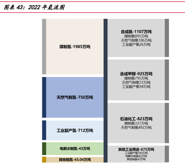 當(dāng)前國(guó)內(nèi)氫能大部分應(yīng)用于工業(yè)領(lǐng)域,包括合成氨、合成甲醇及石油化工。隨著 長(zhǎng)期碳中和目標(biāo)的提出,氫氣的能源屬性將逐漸顯現(xiàn),應(yīng)用領(lǐng)域?qū)⒅鸩酵卣怪岭娏Α?交通、建筑等場(chǎng)景。以中國(guó) 2022 年氫產(chǎn)能下游應(yīng)用為例,其中合成氨氫氣需求 1107 萬噸,占 31.1%。合成氨作為化肥和其他化工產(chǎn)品的重要原材料,60%用于農(nóng)業(yè)化肥生 產(chǎn),30%用于工業(yè)生產(chǎn),而交通部門(船舶運(yùn)輸)和發(fā)電部門(摻氨燃燒)占比很低。 合成甲醇?xì)錃庑枨?925 萬噸,占 26.2%。合成甲醇大部分用于化工合成,主要合成 產(chǎn)品為烯烴、甲醛、醋酸、MTBE 以及二甲醛等。石油煉化氫氣需求 823 萬噸, 占 23.3%。 未來,氫氣因其熱值高,質(zhì)量能量密度大的特點(diǎn)或?qū)⒈粡V泛應(yīng)用于交通領(lǐng)域,氫 燃料電池汽車比傳統(tǒng)的純電動(dòng)車具備更長(zhǎng)的續(xù)航能力。2022 年我國(guó)氫燃料電池車?yán)?計(jì)銷量 12682 輛,加氫站累計(jì)建成 274 座,依據(jù)中國(guó)國(guó)家發(fā)展和改革委員會(huì)發(fā)布《氫 能產(chǎn)業(yè)發(fā)展長(zhǎng)期規(guī)劃(2021-2035)》提出,到 2025 年燃料電池車輛保有量約為 5 萬 輛。同時(shí),因氫氣單位質(zhì)量的熱值遠(yuǎn)大于天然氣,能夠更好地滿足建筑供熱需求而應(yīng) 用于建筑發(fā)電等其他領(lǐng)域。