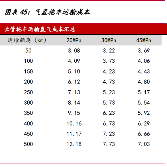 氣氫拖車是目前國(guó)內(nèi)最成熟的氫氣運(yùn)輸形式,我國(guó)氫氣管束式集裝箱和氫氣長(zhǎng)管 拖車大多采用鋼制大容積無縫高壓氣瓶和鋼制內(nèi)膽碳纖維環(huán)向纏繞氣瓶,工作壓力通 常為 20Mpa,單次運(yùn)輸氫氣質(zhì)量小,運(yùn)輸效率低,適用于 200 公里以內(nèi)的短距離運(yùn)輸。 綜合市場(chǎng)上管束式氫氣集裝箱的平均輸氫量,假設(shè) 20/30/45MPa 管束式集裝箱最大可 運(yùn)輸氫氣質(zhì)量 340/650/950 千克,管束式集裝箱費(fèi)用 60/70/80 萬,單位壓縮電耗 2/4.5/6kWh/kg,則運(yùn)距 500 公里的運(yùn)輸成本高達(dá) 7 元/kg 以上。
