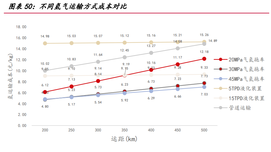目前國(guó)內(nèi)氣氫拖車運(yùn)輸?shù)慕?jīng)濟(jì)性明顯,且廣泛用于商品氫氣運(yùn)輸。而國(guó)外大多采 用液氫運(yùn)輸,運(yùn)輸方式已較為成熟,同時(shí),國(guó)內(nèi)管道建設(shè)與西方國(guó)家仍存在較大差距, 美國(guó)氫氣管道規(guī)模最大,總里程達(dá)到 2720km,歐洲輸氫總里程也已突破 1500km,我 國(guó)氫能產(chǎn)業(yè)起步較晚,自主建設(shè)的典型純輸氫管道共有 3 條,總里程數(shù)不足 100km。 因此,適用于遠(yuǎn)距的管道運(yùn)輸和液氫運(yùn)輸受限于技術(shù)壁壘和基礎(chǔ)設(shè)施建設(shè),運(yùn)輸成本 暫時(shí)高于氣氫拖車。按考慮氧氣沖減的電氫成本 10 元/kg 計(jì)算,計(jì)及運(yùn)輸成本后, 電氫利用成本達(dá)到 16-18 元/kg,目前比煤制氫成本相對(duì)較高,電氫經(jīng)濟(jì)性大幅減弱, 盡管仍低于天然氣制氫,但氫氣實(shí)際所需運(yùn)距較長(zhǎng),運(yùn)往現(xiàn)存下游產(chǎn)能依然受限。