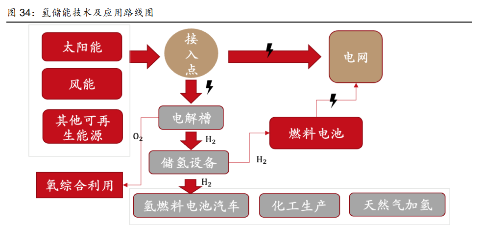 與其他儲能方式相比,氫能更能滿足大規(guī)模、長時間消納需求。與抽水儲能、鋰電池儲能 等方式相比,其具有邊際成本低、能量密度大、無自衰減等優(yōu)勢,能夠?qū)崿F(xiàn)跨周、跨季儲 能。但其實際應用需要經(jīng)過光伏發(fā)電到制氫再由儲氫發(fā)電的兩次轉(zhuǎn)換,短期內(nèi)儲能效率較 低。鋰電儲能的效率更高,適用于日度調(diào)峰;氫能更針對于大規(guī)模儲能和季度調(diào)峰,擴容 只需要增加儲氫設備,邊際成本更低。
