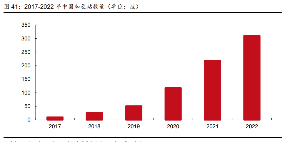 加氫站布局加快,逐漸形成網(wǎng)絡。加氫站等基礎設施是否完善是影響消費者購買氫燃料電 池汽車熱情的主要因素。隨著國內(nèi)氫燃料電池汽車累計銷量增加,中石化、中石油等能源 央企不斷加大加氫基礎設施的投資和建設力度,國內(nèi)加氫站數(shù)量呈現(xiàn)快速增長趨勢。截至 2022 年底,我國加氫站累計建成數(shù)量達到 274 座。根據(jù) 2020 年中國汽車工程學會發(fā)布 的《節(jié)能與新能源汽車技術路線圖 2.0》相關規(guī)劃,到 2035 年加氫站的建設目標為至少 5000 座,中國未來加氫基礎設施的市場規(guī)模在 2030-2050 年將突破千億。此外,我國加 氫站建設參與主體呈現(xiàn)多樣化趨勢,采取規(guī)?;ㄔO或加油/加氫/加氣站合建等方式來拓 展加氫基礎設施網(wǎng)絡,單位加注成本也有望下降。