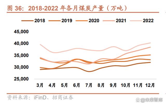 在保供政策的支持下,2022 年國(guó)內(nèi)煤炭供應(yīng)在進(jìn)口煤炭?jī)r(jià)格暴漲的情況下基本維持穩(wěn)定。2022 年,全國(guó)煤炭產(chǎn)量 45.6 億噸,同比增長(zhǎng) 10.6%,比去年增加 4.4 億噸,創(chuàng)歷史新高。2022 年各個(gè)月煤炭產(chǎn)量在近五年均為最高。進(jìn)口 煤炭 2.93 億噸,同比增長(zhǎng) 43.34%,其中 8-12 月份煤炭進(jìn)口量遠(yuǎn)高于往年同期水平。庫(kù)存方面,2022 年全國(guó)煤炭庫(kù) 存由 1 月的 1945 萬(wàn)噸增長(zhǎng)到年末的 2057 萬(wàn)噸,增長(zhǎng) 5.7%。港口庫(kù)存上,秦皇島港、黃驊港煤炭庫(kù)存 2022 年內(nèi)均 有上升,其中秦皇島港年內(nèi)最高庫(kù)存達(dá)到 592 萬(wàn)噸,相較于年初增長(zhǎng) 31.8%。內(nèi)陸省份上,東北、華東、西南、西北 煤炭庫(kù)存在年內(nèi)均有上漲,六大發(fā)電集團(tuán)(國(guó)家電投、華能集團(tuán)、國(guó)家能源集團(tuán)、華電集團(tuán)、大唐集團(tuán)、三峽集團(tuán)) 煤炭庫(kù)存在年末達(dá)到 1206.8 萬(wàn)噸,較年初增長(zhǎng) 3.8%。