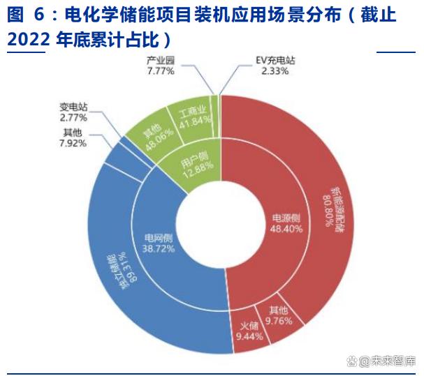 從應(yīng)用場景看,2022 年儲能應(yīng)用場景仍以新能源配儲及電網(wǎng)側(cè)獨(dú)立儲能為主。根據(jù) 中電聯(lián)統(tǒng)計(jì)口徑,截至 2022 年底,已投運(yùn)的電化學(xué)儲能電站累計(jì)裝機(jī)主要分布在電源側(cè), 占比達(dá) 48.4%,其次為電網(wǎng)側(cè) 38.72%和用戶側(cè) 12.88%。2022 年各應(yīng)用場景新增裝機(jī)占 比基本保持不變,電源側(cè)占比 49.24%,其次為電網(wǎng)側(cè) 43.13%和用戶側(cè) 7.63%。從具體 場景看,新能源配儲為電源側(cè)主要場景,獨(dú)立儲能為電網(wǎng)側(cè)主要場景。