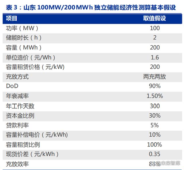 獨立儲能已初步具備盈利能力。以山東 100MW/200MWh 獨立儲能電站為例(全生命周期 10 年,循環(huán)次數(shù) 6000 次,年衰減 1.5%),其儲能盈利模式為現(xiàn)貨市場套利+容 量租賃+容量補償。山東省容量租賃標準采用市場競價方式,制定最高限價及最低保底價, 假設(shè)成交價為 200 元/kW*年,容量電價為 0.0991 元/kWh,假設(shè)現(xiàn)貨市場價差維持在 0.35 元/kWh,年工作天數(shù)為 300 天,儲能系統(tǒng)成本為 1.6 元/Wh,則其全投資 IRR 可達 7.20%。