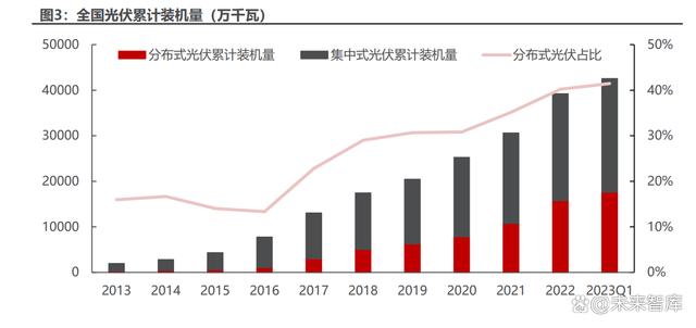 我國分布式光伏累計(jì)裝機(jī)占比逐漸提升。相比于集中式光伏,分布式光伏規(guī)模 較小、輸出電壓功率較小且更接近用戶側(cè),具有投資小、建設(shè)快、占地面積小等優(yōu) 勢(shì)。截至 2022 年底,中國光伏累計(jì)裝機(jī)量達(dá) 392GW,其中分布式光伏累計(jì)裝機(jī) 量達(dá) 158GW,占比 40%。