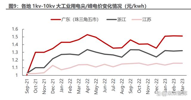 “分時(shí)電價(jià)”、“電力市場(chǎng)化”政策驅(qū)動(dòng),大工業(yè)平均用電價(jià)格提高。2021 年 下半年全國大部分省份陸續(xù)出臺(tái)分時(shí)電價(jià)政策,調(diào)整峰谷電價(jià)及峰谷時(shí)段,其中以 江蘇、廣東、浙江為例的經(jīng)濟(jì)發(fā)達(dá)省份率先、多次調(diào)整,峰谷價(jià)差有較大幅度的擴(kuò) 大,尖、峰時(shí)段也有不同程度的延長,大工業(yè)平均用電價(jià)格提高。