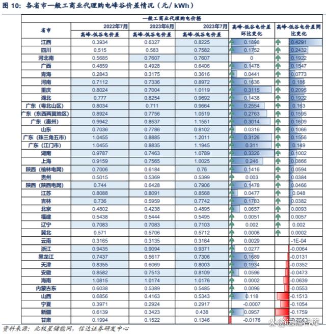 全國峰谷價差大于 0.7 元/kWh 的省份已達 19 個,且價差呈擴大趨勢。0.7 元/kWh 為工商業(yè)儲能具備經(jīng)濟性的峰谷價差門檻值。數(shù)量變化上,2022 年 7 月至 2023 年 7 月,我國峰谷價差超過 0.7 元/kWh 的省份從 16 個增加至 19 個。價差變化上,共有 20 個地區(qū)的峰谷價差增大,如江西省從0.3934/kWh 提升至 0.8225/kWh,山東省從 0.7036/kWh 提升至 0.8102/kWh。各地峰谷價差普遍拉 大,意味著配置工商業(yè)儲能的套利空間擴大。