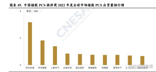 當前儲能 PCS 生產(chǎn)廠商眾多,與光伏逆變器廠商高度重合。儲能變流器與光伏逆變器的最主要 作用都是實現(xiàn)交直流的轉(zhuǎn)換,所以兩種產(chǎn)品的主要零部件類似,且在應用端也開始呈現(xiàn)高度的協(xié) 同效應。在光伏 PCS 已經(jīng)取得非常大的市場規(guī)模的前提下,未來儲能 PCS 的競爭格局與光伏逆 變器趨同,延續(xù)光伏 PCS 格局。當前儲能 PCS 行業(yè)賽道參與者眾多,來自光伏逆變器、不間斷 電源(UPS)、充電樁(EV charger)、電網(wǎng)側-輸配電設備(PTD、MVD、APF、SVG)等多領 域廠商。據(jù) CNESA 數(shù)據(jù),2022 年度全球市場中儲能 PCS 出貨量排名前十位的中國儲能 PCS 提 供商,依次為陽光電源、科華數(shù)能、上能電氣、古瑞瓦特、盛弘股份、南瑞繼保、固德威、索英 電氣、匯川技術和首航新能源。
