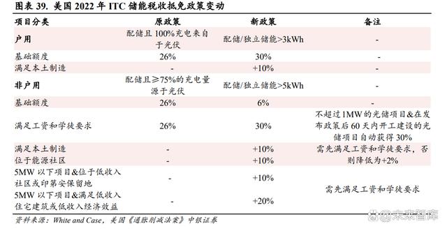 補貼時間延長疊加光伏解綁,有望刺激儲能快速放量。美國聯(lián)邦政府自 2006 年起開始實施投資稅收 抵免政策(ITC),2022 年 8 月美國通過通脹削減法案(IRA),對光伏及儲能均提出新的 ITC 政 策支持,核心變動有二:1)光伏:法案的通過提供了長達十年的稅收抵免政策,同時稅收抵免比例 從 26%提升至 30%,若滿足相關條件,最高稅收抵免可提升至 70%;2)儲能:除光伏配儲在補貼 范圍內(nèi)之外,IRA 首次將獨立儲能納入補貼范圍。此前 ITC 法案中對儲能有諸多參與限制,首先需 要與光伏配對,其次大部分的充電量需來源于光伏發(fā)電,導致儲能的收益和商業(yè)模式受到較大限制, ITC 對獨立儲能的政策刺激將有效激活市場,促進多元商業(yè)模式開展。