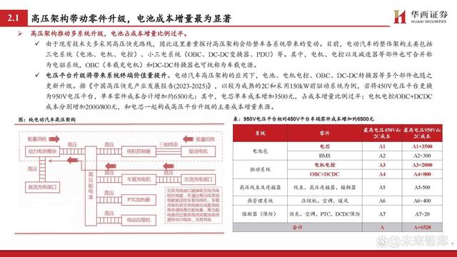 高壓架構(gòu)推動(dòng)多系統(tǒng)升級(jí),電池占成本增量比例過(guò)半。 由于現(xiàn)有技術(shù)大多采用高壓快充路線(xiàn),因此這里著重探討高壓架構(gòu)會(huì)給整車(chē)各系統(tǒng)帶來(lái)的變動(dòng)。目前,電動(dòng)汽車(chē)的整體架構(gòu)主要包括 三電系統(tǒng)(電池、電機(jī)、電控)、小三電系統(tǒng)(OBC、DC-DC變換器、PDU)等。其中,電機(jī)、電控以及減速器等部件也可合并稱(chēng) 為電驅(qū)系統(tǒng),OBC(車(chē)載充電機(jī))和DC-DC轉(zhuǎn)換器也可統(tǒng)稱(chēng)為車(chē)載電源。 電壓平臺(tái)升級(jí)將帶來(lái)系統(tǒng)終端價(jià)值量提升。電動(dòng)汽車(chē)高壓架構(gòu)的應(yīng)用下,電池、電機(jī)電控、OBC、DC-DC轉(zhuǎn)換器等多個(gè)部件也隨之 更新升級(jí)。據(jù)《中國(guó)高壓快充產(chǎn)業(yè)發(fā)展報(bào)告(2023-2025)》,以較為成熟的2C和采用150kW前驅(qū)動(dòng)系統(tǒng)為例,若將450V電壓平臺(tái)更換 為950V電壓平臺(tái),單車(chē)零件成本合計(jì)增加約6500元;其中,電芯單車(chē)成本增加3500元,占成本增量比例過(guò)半;電機(jī)電控/OBC+DCDC 成本分別增加2000/800元,和電芯一起構(gòu)成高壓平臺(tái)升級(jí)的主要成本增量來(lái)源。