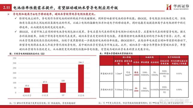 導(dǎo)電劑加速離子&電子移動(dòng)速率,碳納米管較常規(guī)導(dǎo)電劑性能更優(yōu)。除鋰電池主材外,導(dǎo)電劑作為鋰電池的材料構(gòu)成中的關(guān)鍵輔材,同樣影響著鋰電池的倍率性能。據(jù)GGII,導(dǎo)電劑在活性物質(zhì)之間、活性 物質(zhì)與集流體之間起到收集微電流的作用,以減小電極的接觸電阻并加速電子的移動(dòng)速率,同時(shí)也能有效提高鋰離子在電極材料中的遷 移速率,從而提高電極的充放電效率。 據(jù)GGII,目前市場(chǎng)上應(yīng)用的鋰電池導(dǎo)電劑包括以炭黑、導(dǎo)電石墨為代表的常規(guī)導(dǎo)電劑和以碳納米管、石墨烯為代表的新型導(dǎo)電劑。據(jù)天 奈科技招股書(shū),相較于常規(guī)導(dǎo)電劑的代表炭黑,碳納米管具有更好的導(dǎo)電性能,并能夠使鋰電池保持良好的電子和離子傳導(dǎo);此外,碳 納米管憑借其較高長(zhǎng)徑比的特性,相較于炭黑能夠進(jìn)一步提高鋰電池的倍率性能。據(jù)GGII預(yù)計(jì),在高倍率電池需求增加等因素的推動(dòng)下, 新型導(dǎo)電劑將在未來(lái)幾年逐步替代傳統(tǒng)導(dǎo)電劑,其中碳納米管有望成為市場(chǎng)主流。此外,碳納米管一般分為單壁和多壁碳納米管,單壁 碳納米管因?yàn)殚L(zhǎng)徑比更大,從而擁有更優(yōu)的理化性能和導(dǎo)電性能,有望成為碳納米管未來(lái)的重點(diǎn)發(fā)展方向。