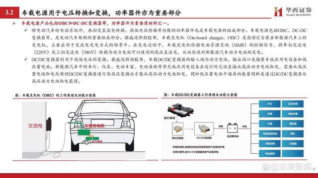 車(chē)載電源產(chǎn)品包括OBC和DC-DC變換器等,功率器件為重要原材料之一。 除電動(dòng)汽車(chē)的電驅(qū)系統(tǒng)外,承擔(dān)交直流電轉(zhuǎn)換、高低電壓轉(zhuǎn)換等功能的功率器件也是車(chē)載電源的組成部分。車(chē)載電源包括OBC、DC-DC 變換器等,是電動(dòng)汽車(chē)架構(gòu)的重要組成部分。據(jù)威邁斯招股書(shū),車(chē)載充電機(jī)(On-board charger,OBC)是指固定安裝在新能源汽車(chē)上的 充電機(jī),主要應(yīng)用于交流電充電方式的場(chǎng)景中。在充電過(guò)程中,車(chē)載充電機(jī)依據(jù)電池管理系統(tǒng)(BMS)的控制信號(hào),將單相交流電 (220V)或三相交流電(380V)轉(zhuǎn)換為動(dòng)力電池可以使用的高壓直流電,從而實(shí)現(xiàn)對(duì)新能源汽車(chē)動(dòng)力電池的充電。 DC/DC變換器則用于高低電壓的變換。據(jù)威邁斯招股書(shū),車(chē)載DC/DC變換器的輸入端為動(dòng)力電池,輸出端口連接整車(chē)低壓用電設(shè)備和低 壓蓄電池。新能源汽車(chē)中的車(chē)燈、儀表、電動(dòng)車(chē)窗、電動(dòng)座椅等常見(jiàn)低壓用電設(shè)備在運(yùn)行時(shí)無(wú)法直接從高壓動(dòng)力電池取電,需要從低壓 蓄電池取電或借助DC/DC變換器進(jìn)行高低壓變換后才能從高壓動(dòng)力電池取電,同時(shí)低壓蓄電池中儲(chǔ)存的能量同樣是通過(guò)DC/DC變換器從 高壓動(dòng)力電池取電獲得。