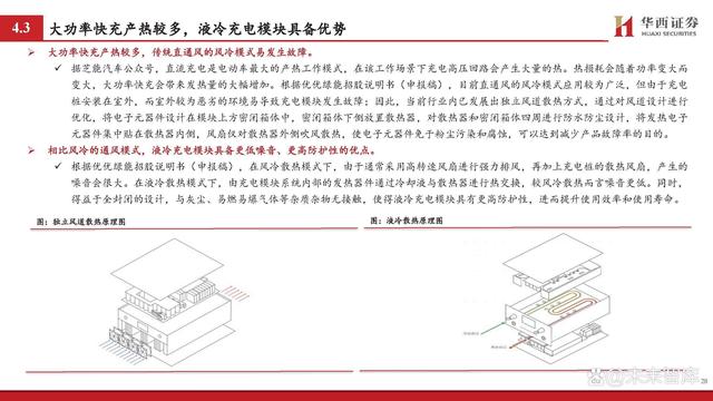 大功率快充產(chǎn)熱較多,傳統(tǒng)直通風(fēng)的風(fēng)冷模式易發(fā)生故障。據(jù)芝能汽車(chē)公眾號(hào),直流充電是電動(dòng)車(chē)最大的產(chǎn)熱工作模式,在該工作場(chǎng)景下充電高壓回路會(huì)產(chǎn)生大量的熱。熱損耗會(huì)隨著功率變大而 變大,大功率快充會(huì)帶來(lái)發(fā)熱量的大幅增加。根據(jù)優(yōu)優(yōu)綠能招股說(shuō)明書(shū)(申報(bào)稿),目前直通風(fēng)的風(fēng)冷模式應(yīng)用較為廣泛,但由于充電 樁安裝在室外,而室外較為惡劣的環(huán)境易導(dǎo)致充電模塊發(fā)生故障;因此,當(dāng)前行業(yè)內(nèi)已發(fā)展出獨(dú)立風(fēng)道散熱方式,通過(guò)對(duì)風(fēng)道設(shè)計(jì)進(jìn)行 優(yōu)化,將電子元器件設(shè)計(jì)在模塊上方密閉箱體中,密閉箱體下側(cè)放置散熱器,對(duì)散熱器和密閉箱體四周進(jìn)行防水防塵設(shè)計(jì),將發(fā)熱電子 元器件集中貼在散熱器內(nèi)側(cè),風(fēng)扇僅對(duì)散熱器外側(cè)吹風(fēng)散熱,使電子元器件免于粉塵污染和腐蝕,可以達(dá)到減少產(chǎn)品故障率的目的。