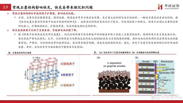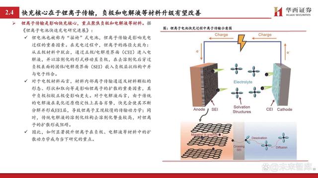 鋰離子傳輸是影響快充核心,重點(diǎn)聚焦負(fù)極和電解液等材料。據(jù) 《鋰離子電池快速充電研究進(jìn)展》: 鋰電池也被稱(chēng)為“搖椅”式電池,鋰離子傳輸是影響充電 過(guò)程的重要因素。在充電過(guò)程中,鋰離子的路徑大致為: 從正極材料中脫出,通過(guò)正極/電解質(zhì)界面(CEI)進(jìn)入電 解液,并以溶劑化的形式移動(dòng)至負(fù)極,在去溶劑化后穿過(guò) 負(fù)極表面的固體/電解質(zhì)界面(SEI)嵌入負(fù)極層狀結(jié)構(gòu)中并 與電子結(jié)合。 對(duì)于電極材料而言,材料內(nèi)部離子傳輸通道及材料顆粒的 形態(tài)、形狀和取向等是影響鋰離子的擴(kuò)散的重要因素,其 中負(fù)極相較正極受影響更大。對(duì)于電解液而言,由于傳統(tǒng) 的電解液在氧化還原穩(wěn)定性上具備劣勢(shì),快充會(huì)使其不斷 分解并形成EEI層,導(dǎo)致鋰離子呈現(xiàn)較慢的傳輸動(dòng)力學(xué);同 時(shí),傳統(tǒng)電解液的溶劑化結(jié)構(gòu)去溶劑化勢(shì)壘較高,對(duì)鋰離 子的擴(kuò)散形成阻礙。 因此,如何顯著提升鋰離子在負(fù)極、電解液等材料中的擴(kuò) 散動(dòng)力學(xué)成為當(dāng)下研究的重點(diǎn)。