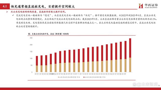從公共充電樁的結(jié)構(gòu)來(lái)看,直流樁仍有較大提升空間。 交流充電系統(tǒng)一般被稱(chēng)為“慢充”,而直流充電系統(tǒng)一般被稱(chēng)為“快充”。據(jù)中國(guó)充電聯(lián)盟數(shù)據(jù),從2022年到2023年9月,直流公共充 電樁的占比整體保持穩(wěn)定,且總體低于交流公共充電樁的占比;截至2023年9月,公共直流樁保有量占公共充電樁保有量的比例為43.1%。 考慮到充電難、充電慢依然是當(dāng)前使用新能源汽車(chē)過(guò)程中需要解決的痛點(diǎn)之一,在之后的充電基礎(chǔ)設(shè)施的建設(shè)過(guò)程中,直流公共充電樁 的占比有望持續(xù)提升。