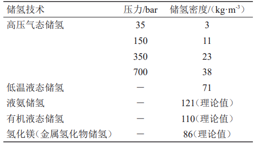 與其他燃料相比,氫的質量能量密度大,但體積能量密度低(汽油的1/3000),因此構建氫儲能系統(tǒng)的重要前提條件之一是在較高體積能量密度下儲存氫氣。目前,主要儲氫方式可以分為物理儲氫和化學儲氫。物理儲氫包括高壓氣態(tài)儲存技術、低溫液態(tài)儲存技術和地質儲氫技術;化學儲氫包括固態(tài)儲存技術、有機液態(tài)儲氫技術和液氨儲氫技術。不同儲氫技術的密度如表2所示。