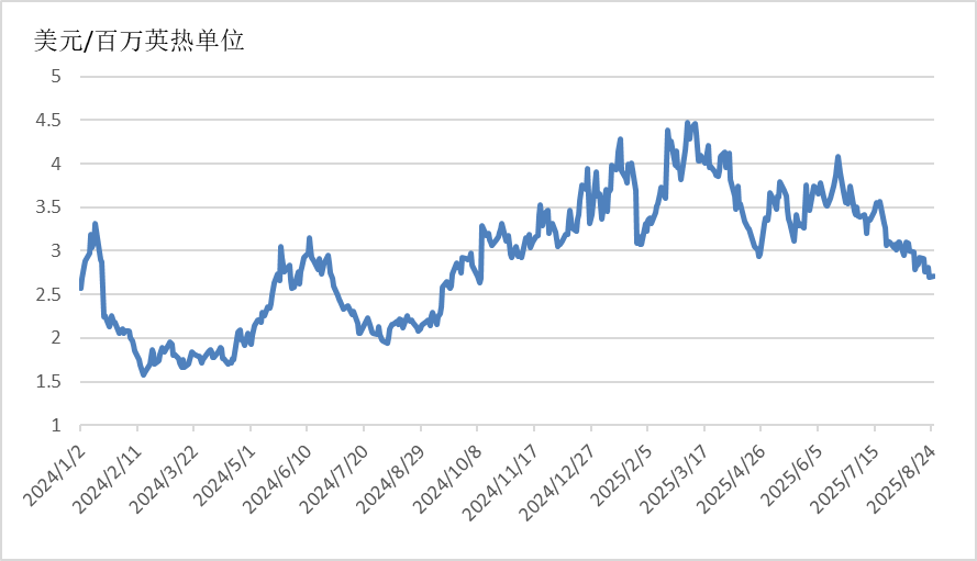 8月,美國天然氣價格震蕩下行。8月上旬,美國大部分地區(qū)氣溫下降,制冷需求減少,居民、商業(yè)用氣量減少5.2%,發(fā)電用氣量下降15.6%,為今年以來單周最大降幅。美國LNG出口終端穩(wěn)定高效運行,全美液化天然氣加工量維持在160億立方英尺/日左右。供應(yīng)方面,7月以來,美國活躍天然氣鉆機(jī)數(shù)量增長至近兩年高位,推動總產(chǎn)量提升至1065億立方英尺/日左右,較去年同期上漲2.79%。庫存方面,截至8月8日,周度庫存增加560億立方英尺,遠(yuǎn)超于市場普遍預(yù)期的530億立方英尺,與過去5年同期均值相比庫存上漲6.56%。高于歷史同期的產(chǎn)量和充足的庫存加劇看空壓力,美國天然氣價格承壓下行。8月4日,美國Henry Hub天然氣價格收于2.952美元/百萬英熱單位,時隔3個月再次下降至3美元/百萬英熱單位以下。8月中下旬,美國多州氣溫上升,推升制冷需求,帶動天然氣總消費量上漲。但受颶風(fēng)“艾琳”侵?jǐn)_影響,F(xiàn)reeport、Sabine Pass、Cameron LNG出口終端相繼進(jìn)入檢修,全美液化天然氣加工量降至每日155億立方英尺左右。供應(yīng)方面,隨著鉆機(jī)數(shù)量階段性地穩(wěn)定增加,全美天然氣產(chǎn)量增加至1070億立方英尺/日左右,持續(xù)刷新歷史高位。庫存方面,盡管庫存增量不及市場預(yù)期,但仍高于過去5年同期均值。在氣溫下降預(yù)期增強(qiáng)、颶風(fēng)或?qū)⒊掷m(xù)影響液化天然氣出口、全美天然氣產(chǎn)量持續(xù)刷新歷史高位、天然氣庫存充足、競爭性能源價格下跌等多重利空因素影響,8月22日,Henry Hub天然氣期貨價格收于2.692美元/百萬英熱單位,這是自2024年11月以來Henry Hub天然氣期貨價格首次下降至2.7美元/百萬英熱單位以下。