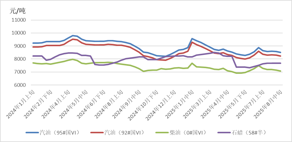 國際原油市場:8月,受“歐佩克+”全面撤回自愿減產(chǎn)額度、美國高額關(guān)稅對各國經(jīng)濟(jì)及原油消費造成沖擊、美國就業(yè)數(shù)據(jù)不及預(yù)期、美俄元首會晤提升市場對地緣局勢緩和預(yù)期以及美國夏季出游旺季結(jié)束等因素影響,全球原油市場過剩壓力再度顯現(xiàn),國際原油期貨價格面臨顯著下行壓力。截至8月25日,WTI、布倫特原油期貨價格分別收于64.8美元/桶、68.8美元/桶,月環(huán)比分別下降0.55%、上漲0.53%。