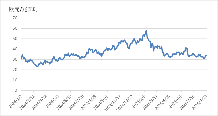 截至8月25日,TTF天然氣期貨主力合約收于33.774歐元/兆瓦時,月環(huán)比上漲3.92%,相較2024年同期的37.655歐元/兆瓦時,下降10.31%。