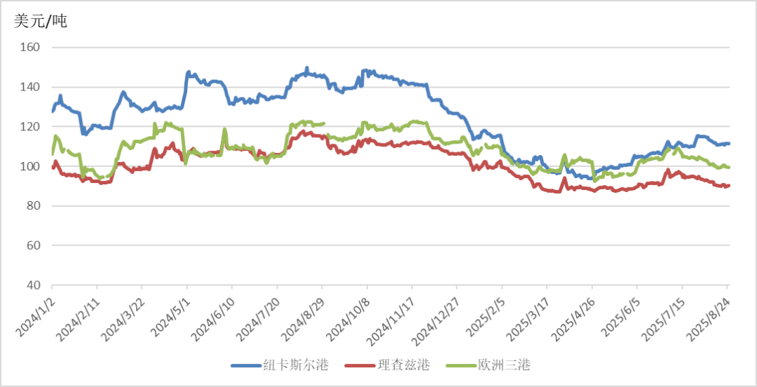 8月中下旬,亞太地區(qū)氣溫有所下降,日韓采購節(jié)奏有所放緩,但受降雨和洪水影響,澳大利亞煤炭生產(chǎn)和發(fā)運繼續(xù)受限,供應(yīng)端偏弱對價格略有支撐,而俄羅斯煤價格優(yōu)勢明顯,部分買家開始轉(zhuǎn)向俄煤等替代供應(yīng)。在上述因素的共同影響下,澳大利亞煤炭價格基本持穩(wěn),紐卡斯?fàn)柛勖禾科谪泝r格維持在110~112美元/噸之間窄幅震蕩。歐洲方面,可再生能源發(fā)電擠壓煤電空間,且原油、天然氣等競爭能源價格下跌,歐洲三港煤炭期貨價格維持在100美元/噸左右窄幅震蕩。南非市場方面,由于印度國內(nèi)煤炭庫存充足,疊加降雨天氣抑制用電需求,印度買家需求較為低迷,南非理查茲港動力煤價格小幅下降。8月22日,南非理查茲港煤炭期貨價格震蕩下行至89.65美元/噸,為近3個月以來最低水平。